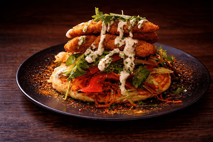 Crispy curry chicken strips by Paul Watters served with a savoury pancake, fresh salad and creamy garlic sauce — bold, balanced and full of flavour.