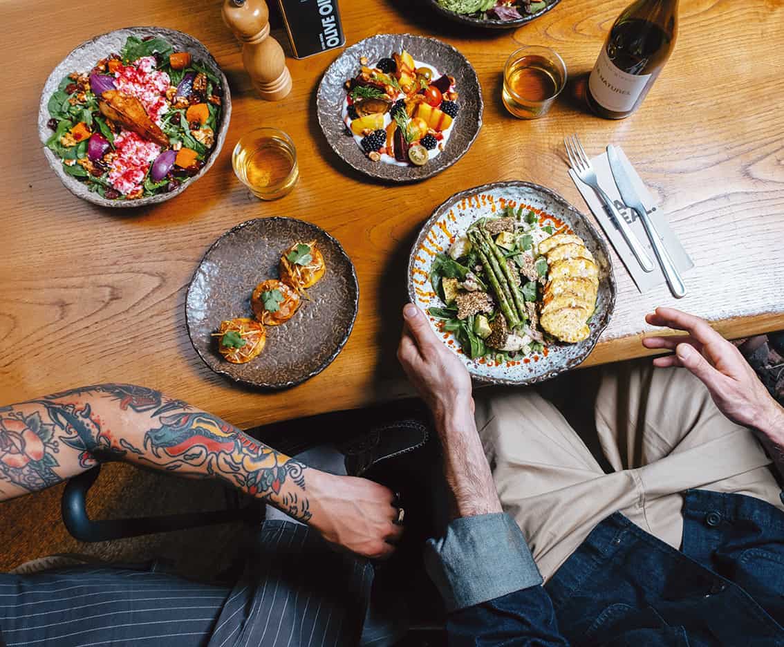 Plates arrive in the centre of the table. Someone passes a bowl of vegetables. Another person adds olive oil or herbs to a dish. Conversation moves easily between bites.