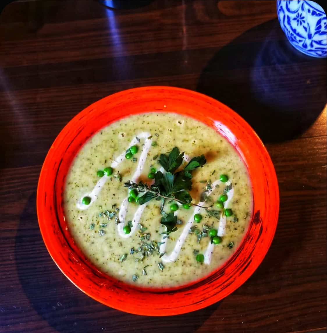 Season the soup with black pepper. Ladle into bowls, drizzle with a little double cream, and spoon over the cooked peas. Garnish with a sprig of thyme and picked flat-leaf parsley